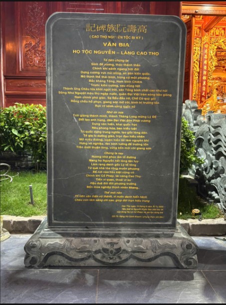 記碑族阮壽高 (CAO THỌ NGUYỄN TỘC BI KÝ) VĂN BIA HỌ TỘC NGUYỄN (GỐC LÝ)– LÀNG CAO THỌ Tổ tiên chúng ta Sinh đế vương, thác thánh thần Chính khí sánh ngang trời đất Dựng cương vực núi sông, an dân kiến quốc, Mở thịnh thế thái bình, hùng cứ một phương.[1] Bắc kháng Tống, Nam bình Chiêm Trước kiên cường, sau dũng liệt Thành Ung Châu lửa khói ngút trời, xác Tống binh chất cao như núi Sông Như Nguyệt máu thù ngập nước, quân Đại Việt tràn sóng bão giông[2] Nam chinh phá giặc, Sạ Đẩu đầu rơi, Chế Củ quỳ gối[3] Rồng chầu hổ phục, giang sơn mở cõi, bình trị trường tồn[4] Rạng danh sách vàng quốc sử Nhớ ơn xưa Trời giáng thánh minh, thành Thăng Long mừng Lý Đế Đất tạo anh hùng, dân Đại Việt đón Phật vương[5] Dựng văn hiến, khai quốc học Nêu phong hóa, ban triều luật[6] Trị quốc dùng trung nghĩa, tạo gốc lòng dân. Tề gia lo dưỡng giáo, trọn đạo hiếu nhân Mở miếu đường, luyện hiền tài làm nguyên khí Hưng võ nghiệp, rèn binh tướng để trường tồn Trên dưới thuận lòng, vững bền một cõi giang sơn Chúng ta nay Nương nhờ phúc ấm tổ đường Mang họ Nguyễn hết lòng tận tụy Vẫn không quên gốc Lý tổ tông Từ quê nhà tỏa rộng muôn phương Để nơi nào hào kiệt cũng có Chính khí Cổ Pháp, tài năng Cao Thọ Tiến vi quan, thoái vi sư Hậu duệ đời đời phương trưởng Bốn mùa nghiệp thịnh nhân khang… Thế mới nên Tổ tiên văn thần võ thánh, vì nước danh hiển hách Cháu con tâm sáng chí cao, giúp đời trọn hiếu trung Cao Thọ ngày lành tháng năm Ất Tỵ 2025 Hậu duệ là Nguyễn Khắc Bẩy (đời thứ 34 dòng Họ Lý Cổ Pháp) và gia tộc dựng bia GS.TS. Đặng Cảnh Khanh (phụng thảo văn bia)